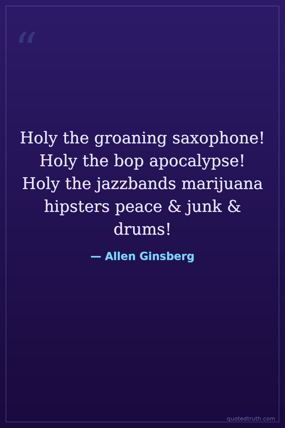 Holy the groaning saxophone! Holy the bop apocalypse! Holy the jazzbands marijuana hipsters peace & junk & drums!