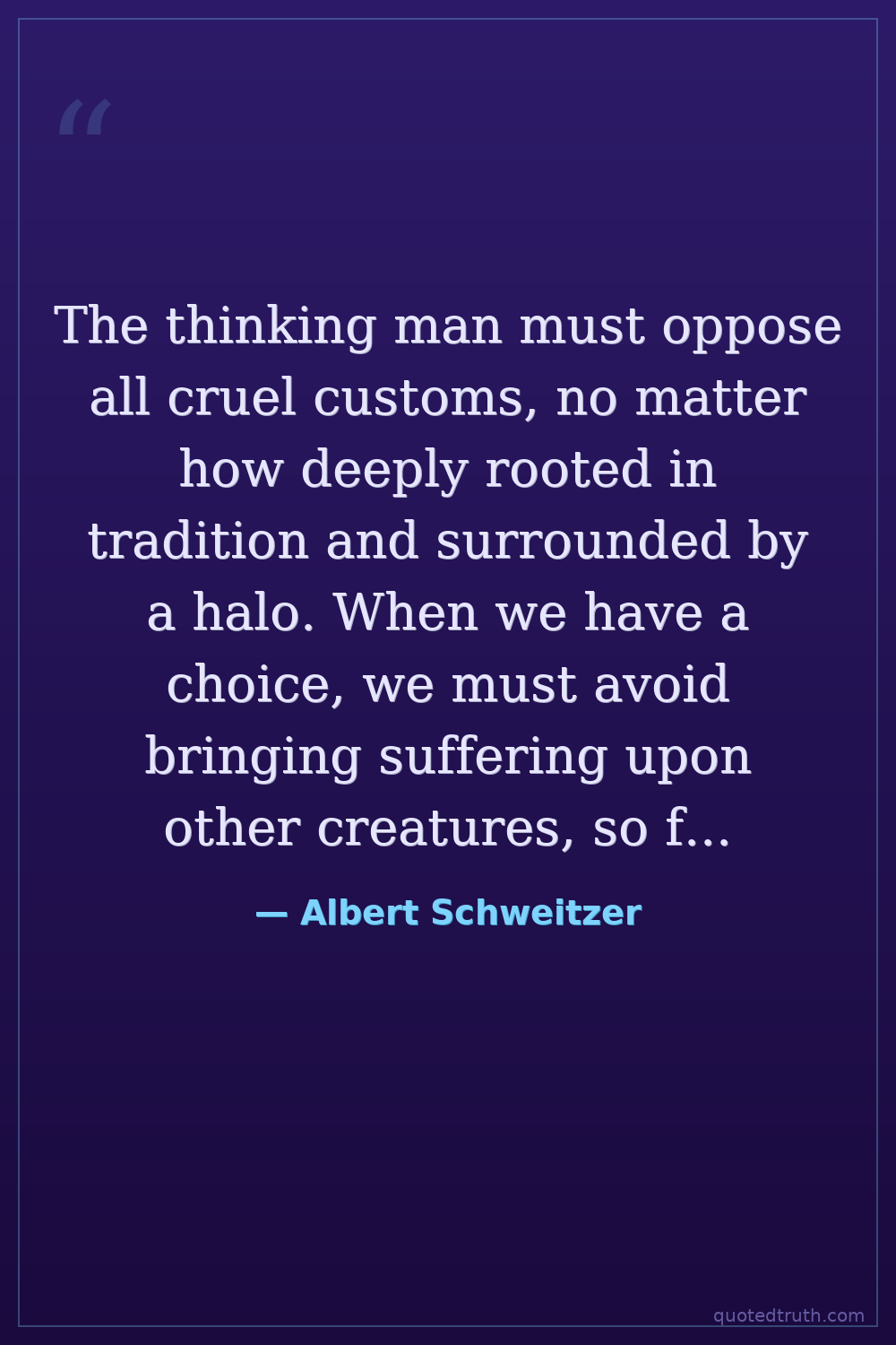The thinking man must oppose all cruel customs, no matter how deeply rooted in tradition and surrounded by a halo. When we have a choice, we must avoid bringing suffering upon other creatures, so far as it is within our power. — Albert Schweitzer Modern Missionary, Nobel laureate