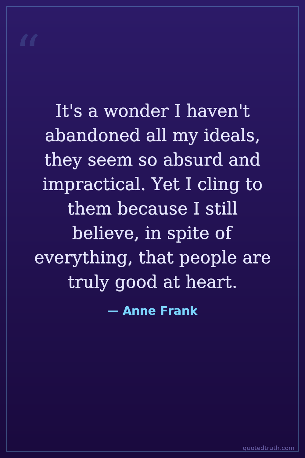 It's a wonder I haven't abandoned all my ideals, they seem so absurd and impractical. Yet I cling to them because I still believe, in spite of everything, that people are truly good at heart.