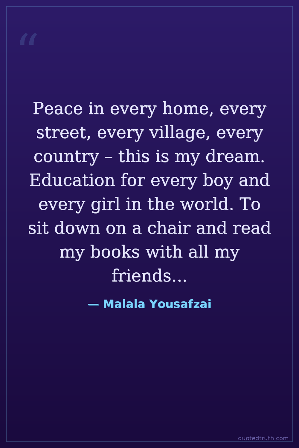 Peace in every home, every street, every village, every country – this is my dream. Education for every boy and every girl in the world. To sit down on a chair and read my books with all my friends at school is my right. To see each and every human being with a smile of happiness is my wish.