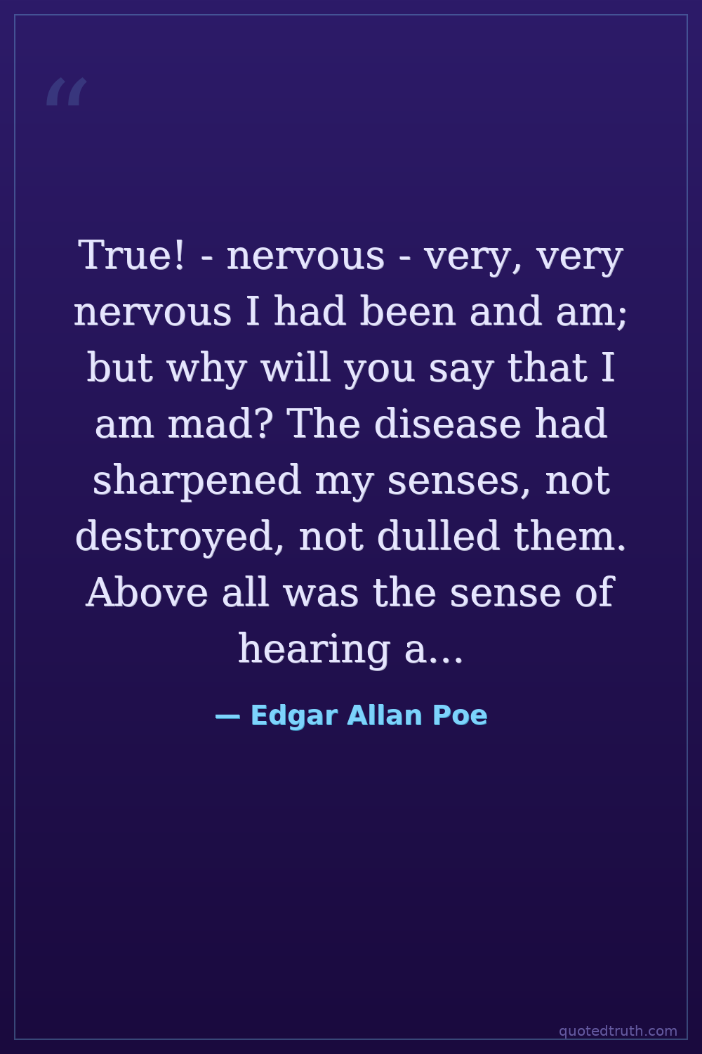 True! - nervous - very, very nervous I had been and am; but why will you say that I am mad? The disease had sharpened my senses, not destroyed, not dulled them. Above all was the sense of hearing acute.