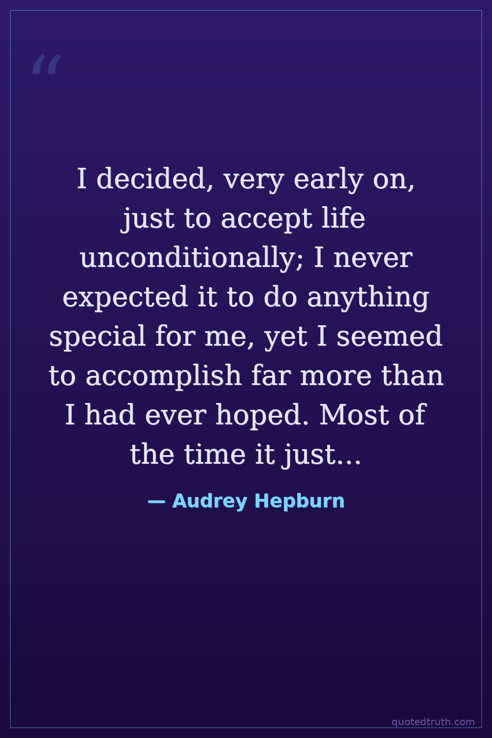 I decided, very early on, just to accept life unconditionally; I never expected it to do anything special for me, yet I seemed to accomplish far more than I had ever hoped. Most of the time it just happened to me without my ever seeking it. — Audrey Hepburn Modern Actress, humanitarian