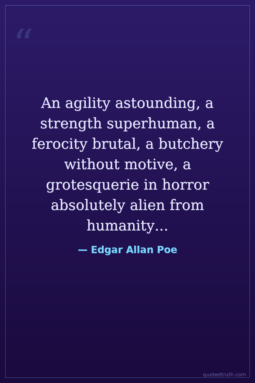 An agility astounding, a strength superhuman, a ferocity brutal, a butchery without motive, a grotesquerie in horror absolutely alien from humanity...