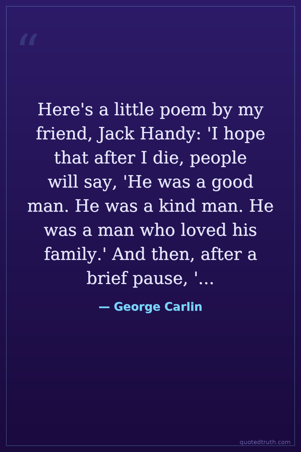 Here's a little poem by my friend, Jack Handy: 'I hope that after I die, people will say, 'He was a good man. He was a kind man. He was a man who loved his family.' And then, after a brief pause, 'But he was no George Carlin.' — George Carlin Contemporary Comedian, social critic