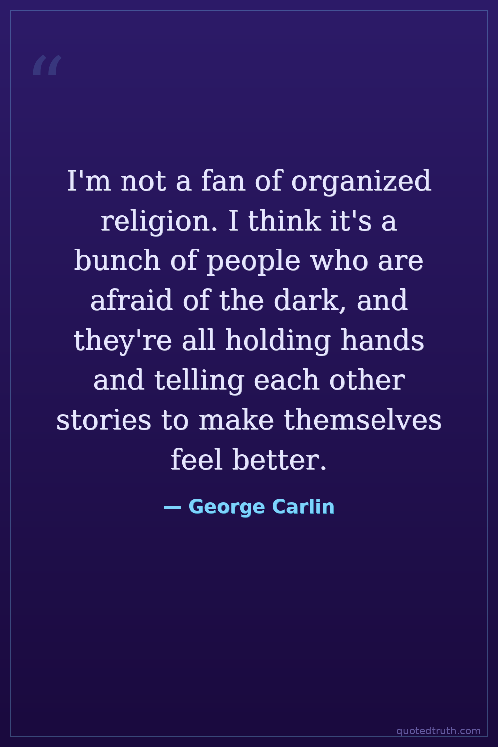 I'm not a fan of organized religion. I think it's a bunch of people who are afraid of the dark, and they're all holding hands and telling each other stories to make themselves feel better.