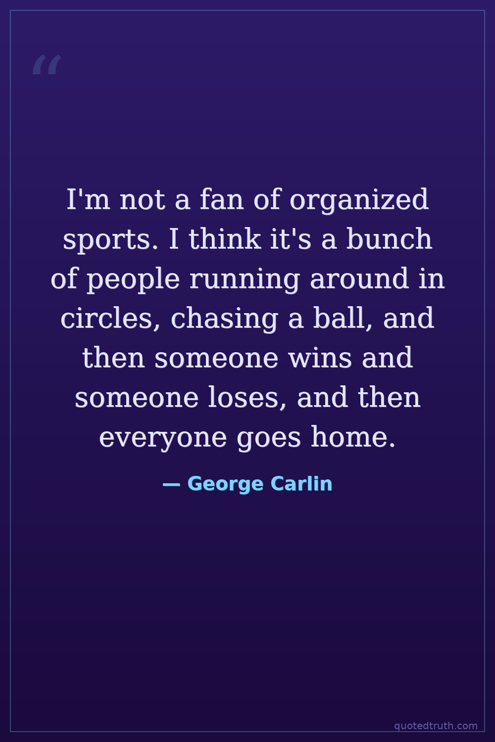 I'm not a fan of organized sports. I think it's a bunch of people running around in circles, chasing a ball, and then someone wins and someone loses, and then everyone goes home.
