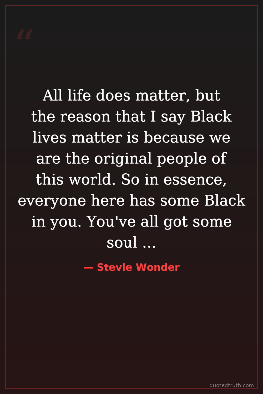 All life does matter, but the reason that I say Black lives matter is because we are the original people of this world. So in essence, everyone here has some Black in you. You've all got some soul in you, so stop denying your culture. — Stevie Wonder Contemporary Musician, songwriter