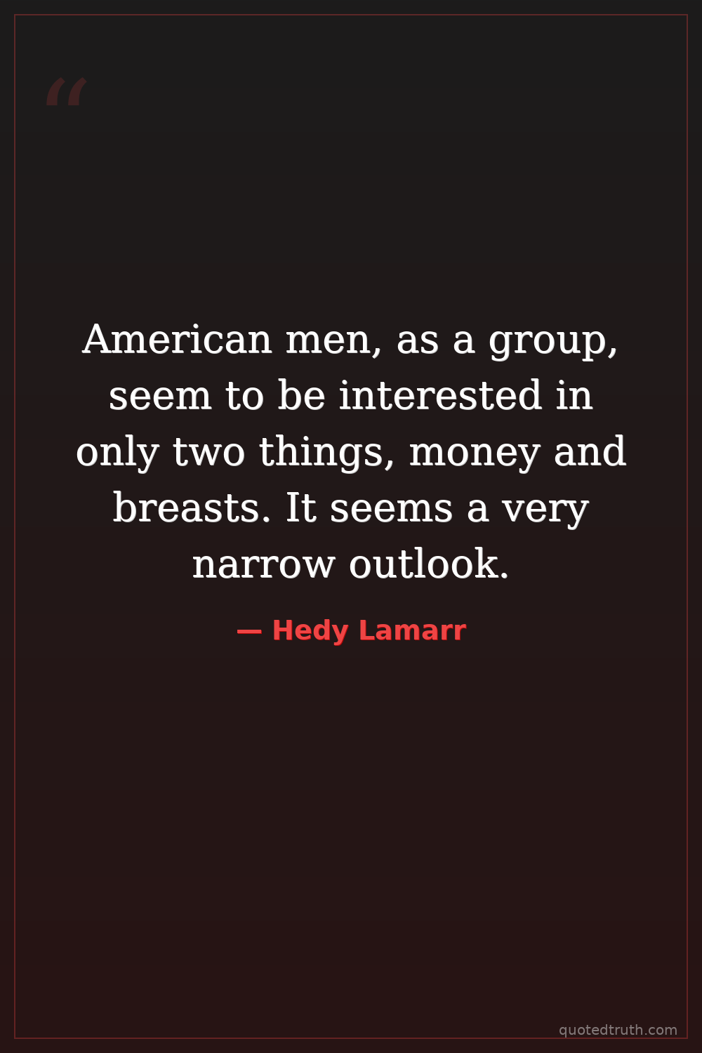 American men, as a group, seem to be interested in only two things, money and breasts. It seems a very narrow outlook.