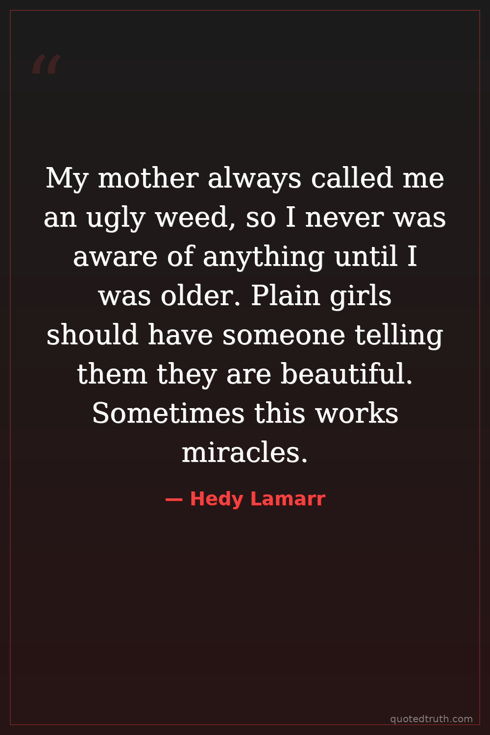 My mother always called me an ugly weed, so I never was aware of anything until I was older. Plain girls should have someone telling them they are beautiful. Sometimes this works miracles.