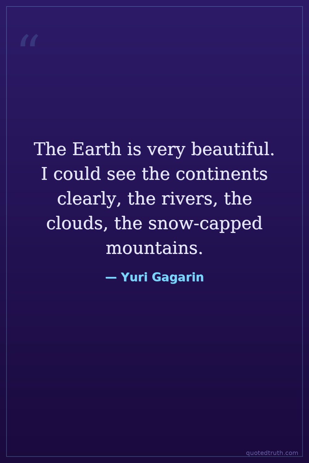 The Earth is very beautiful. I could see the continents clearly, the rivers, the clouds, the snow-capped mountains.