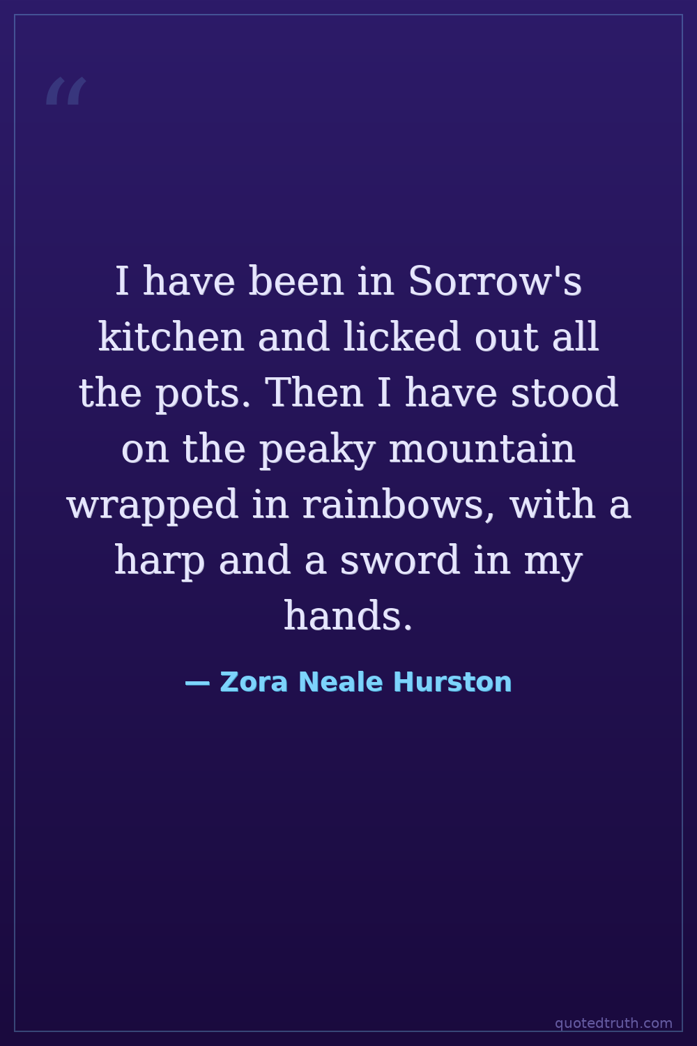 I have been in Sorrow's kitchen and licked out all the pots. Then I have stood on the peaky mountain wrapped in rainbows, with a harp and a sword in my hands.