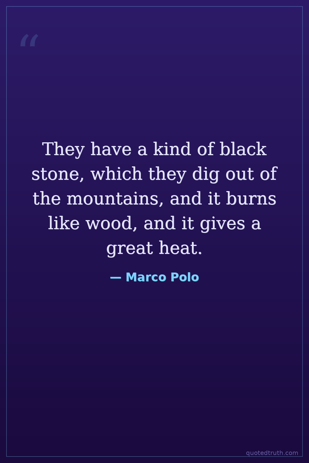They have a kind of black stone, which they dig out of the mountains, and it burns like wood, and it gives a great heat.