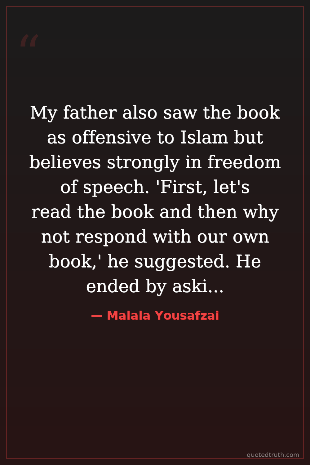 My father also saw the book as offensive to Islam but believes strongly in freedom of speech. 'First, let's read the book and then why not respond with our own book,' he suggested. He ended by asking in a thundering voice my grandfather would have been proud of, 'Is Islam such a weak religion that it cannot tolerate a book written against it? Not my Islam!'