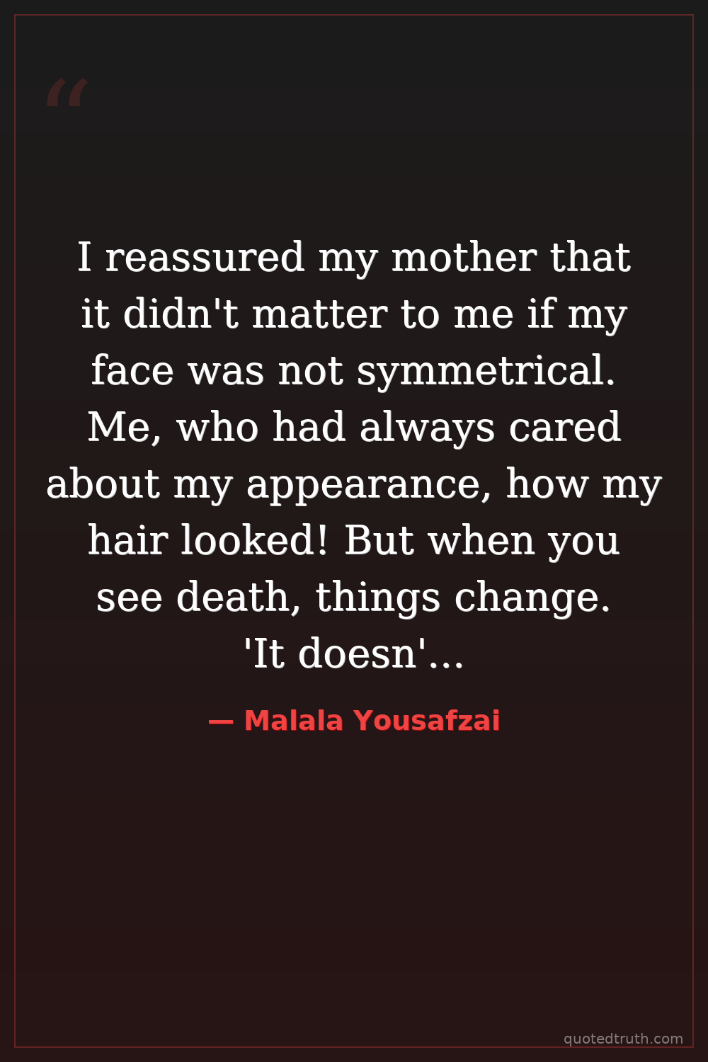 I reassured my mother that it didn't matter to me if my face was not symmetrical. Me, who had always cared about my appearance, how my hair looked! But when you see death, things change. 'It doesn't matter if I can't smile or blink properly,' I told her. 'I'm still me, Malala. The important thing is God has given me my life.'