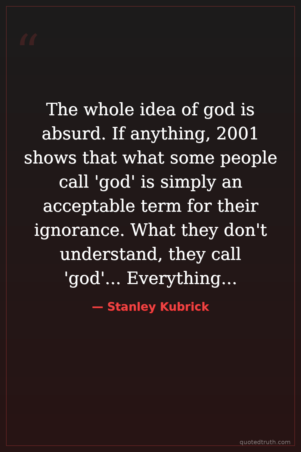 The whole idea of god is absurd. If anything, 2001 shows that what some people call 'god' is simply an acceptable term for their ignorance. What they don't understand, they call 'god'... Everything we know about the universe reveals that there is no god. I chose to do Dr. Arthur C. Clarke's story as a film because it highlights a critical factor necessary for human evolution; that is, beyond our present condition. This film is a rejection of the notion that there is a god; isn't that obvious?