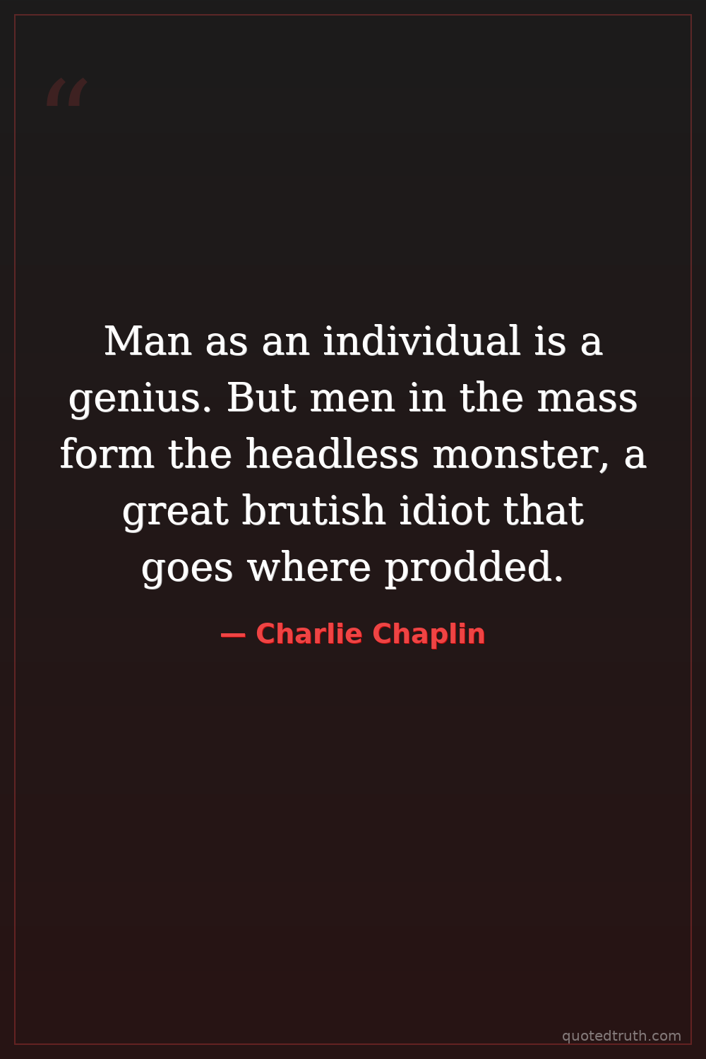 Man as an individual is a genius. But men in the mass form the headless monster, a great brutish idiot that goes where prodded.