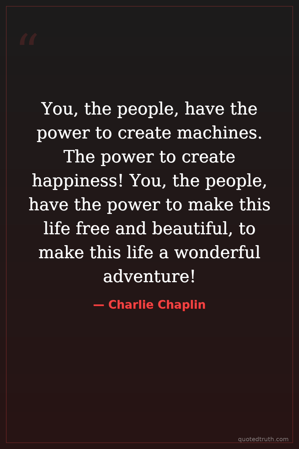 You, the people, have the power to create machines. The power to create happiness! You, the people, have the power to make this life free and beautiful, to make this life a wonderful adventure!