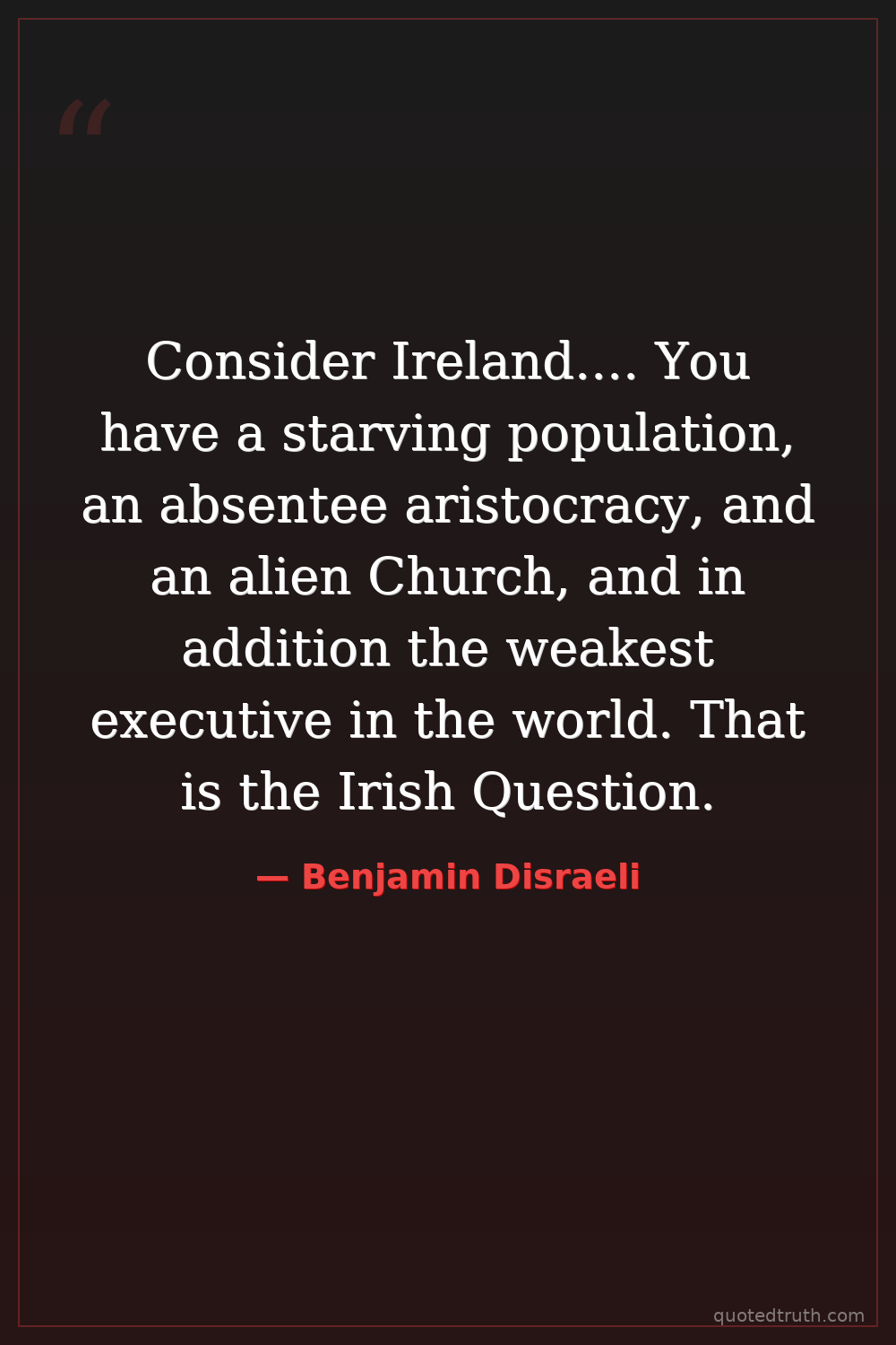 Consider Ireland.... You have a starving population, an absentee aristocracy, and an alien Church, and in addition the weakest executive in the world. That is the Irish Question.
