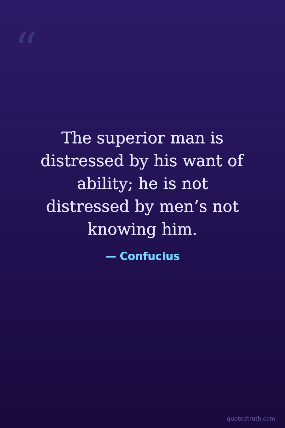 The superior man is distressed by his want of ability; he is not distressed by men’s not knowing him.