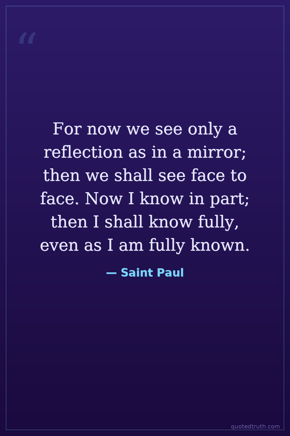 For now we see only a reflection as in a mirror; then we shall see face to face. Now I know in part; then I shall know fully, even as I am fully known.