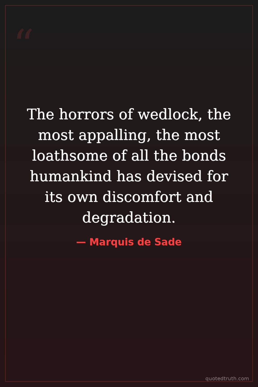 The horrors of wedlock, the most appalling, the most loathsome of all the bonds humankind has devised for its own discomfort and degradation.