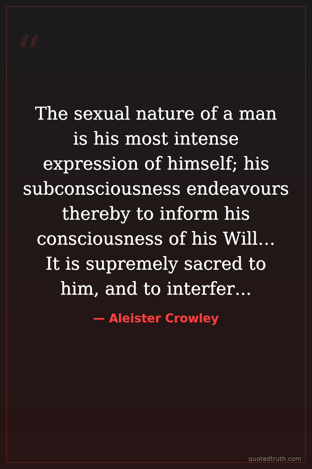 The sexual nature of a man is his most intense expression of himself; his subconsciousness endeavours thereby to inform his consciousness of his Will… It is supremely sacred to him, and to interfere with its expression, or try to edit it, is an abominable crime.
