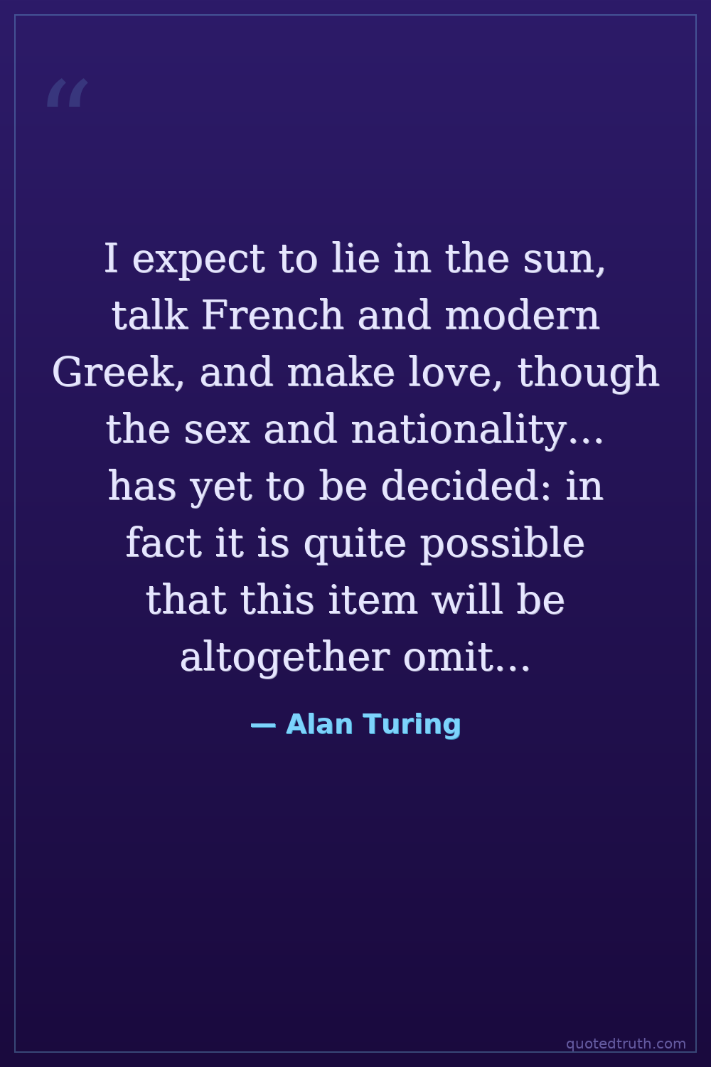 I expect to lie in the sun, talk French and modern Greek, and make love, though the sex and nationality... has yet to be decided: in fact it is quite possible that this item will be altogether omitted.