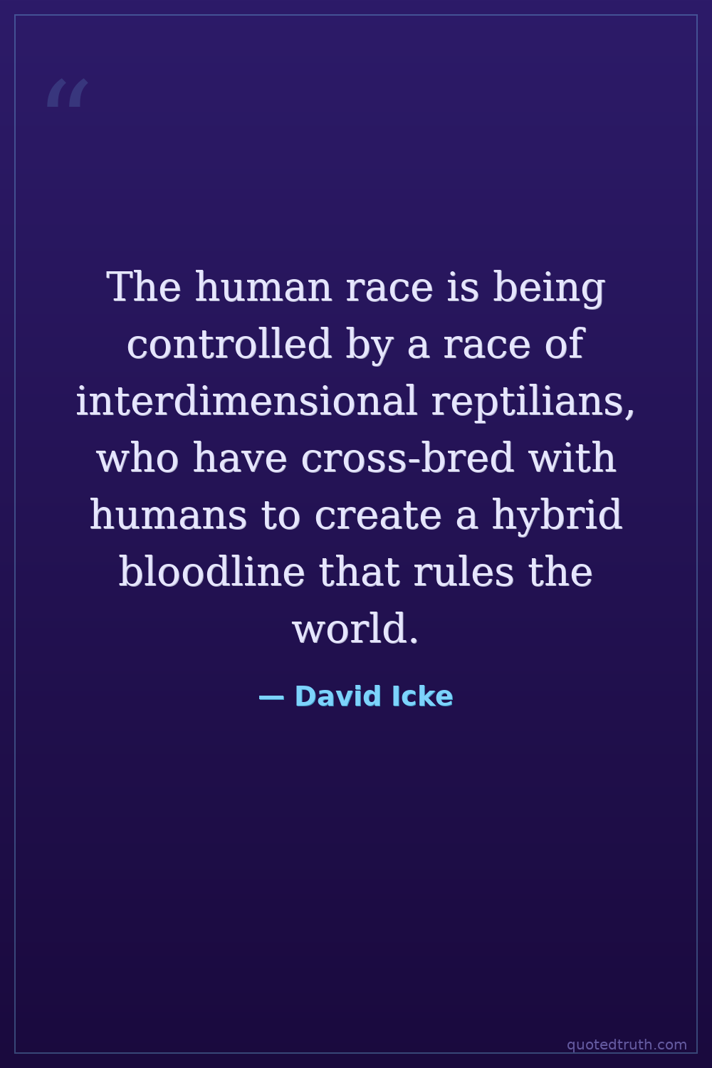 The human race is being controlled by a race of interdimensional reptilians, who have cross-bred with humans to create a hybrid bloodline that rules the world.