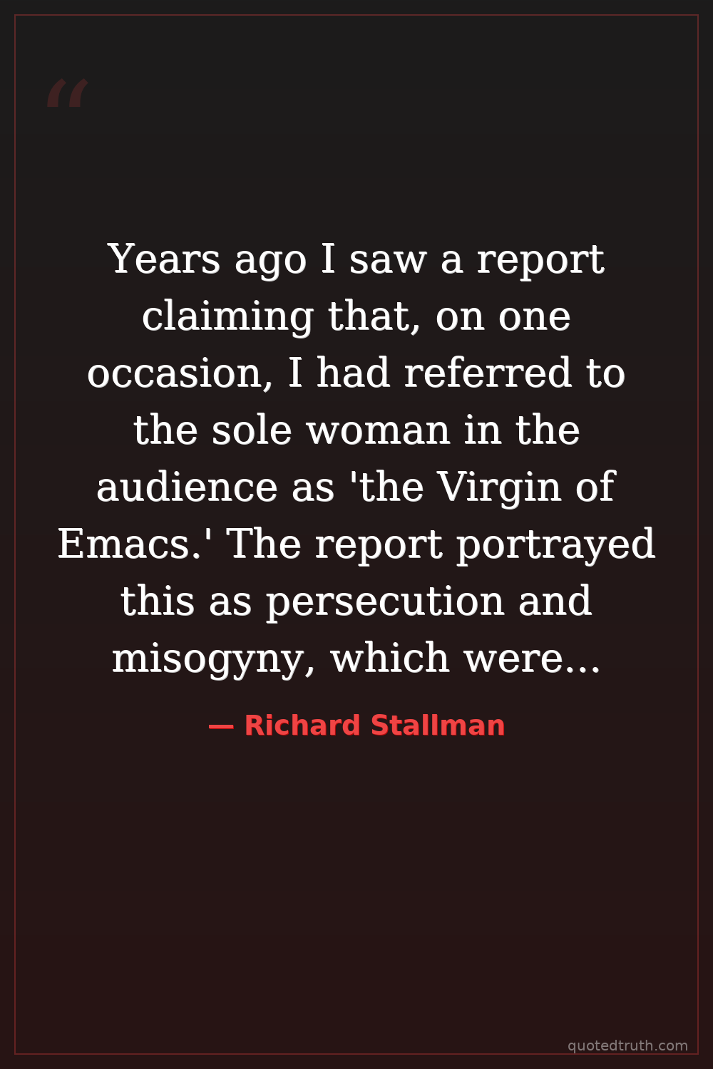 Years ago I saw a report claiming that, on one occasion, I had referred to the sole woman in the audience as 'the Virgin of Emacs.' The report portrayed this as persecution and misogyny, which were certainly not in my mind. — Richard Stallman Contemporary Free software zealot, eccentric habits