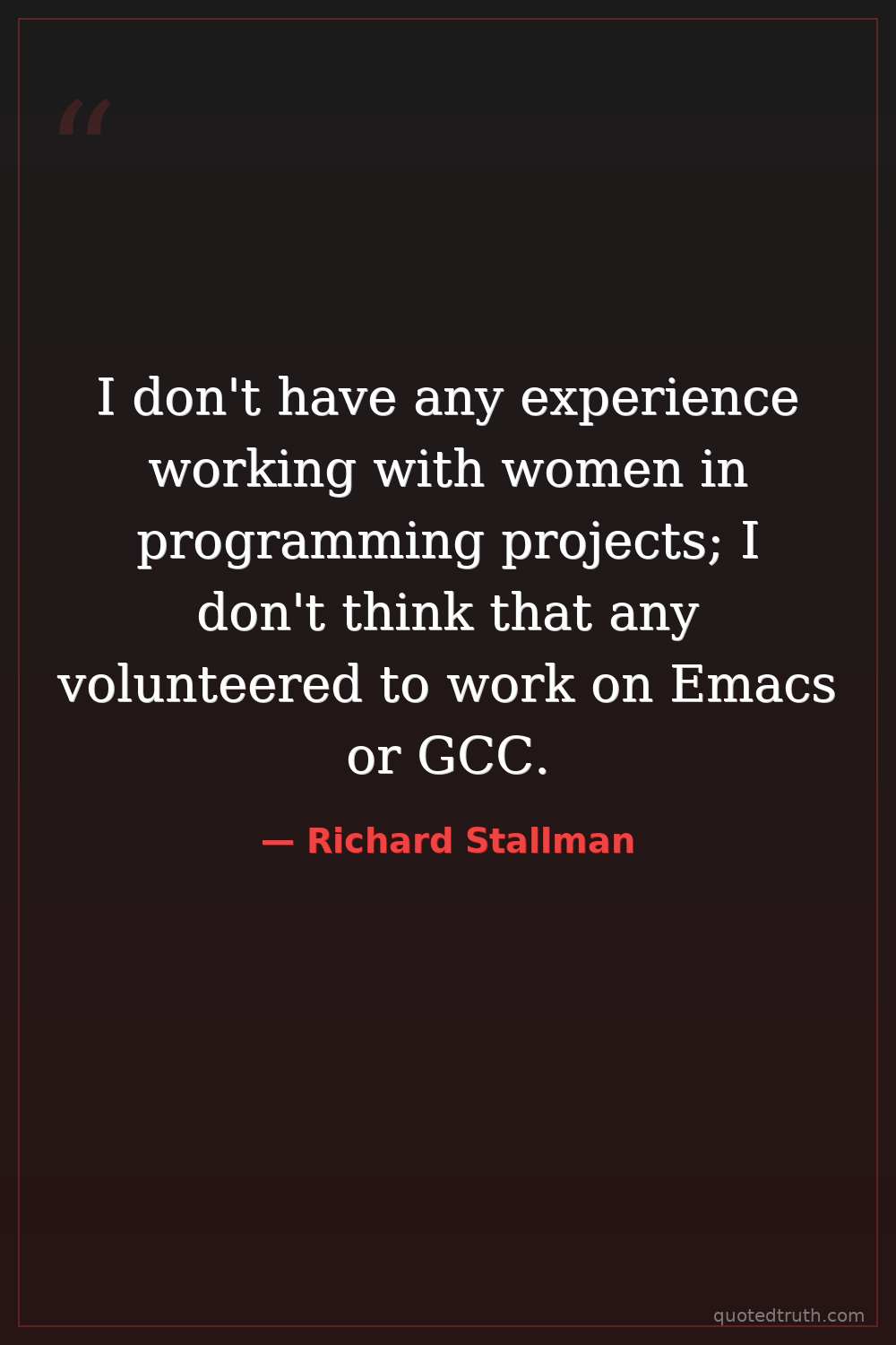 I don't have any experience working with women in programming projects; I don't think that any volunteered to work on Emacs or GCC.