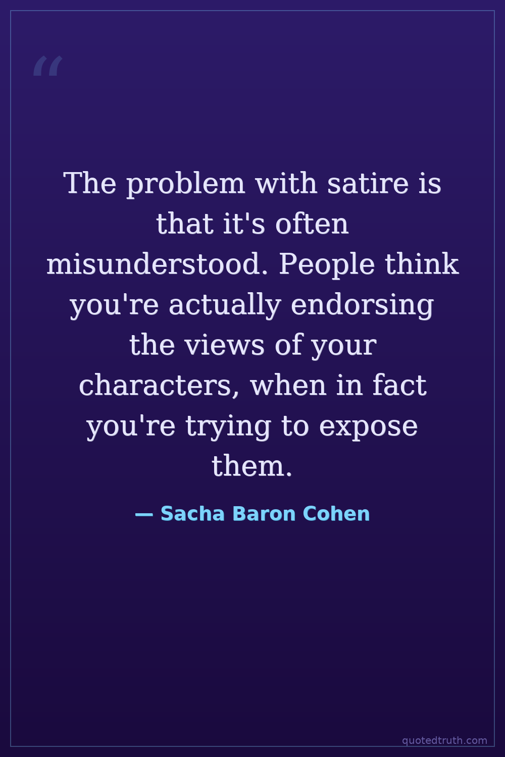 The problem with satire is that it's often misunderstood. People think you're actually endorsing the views of your characters, when in fact you're trying to expose them.