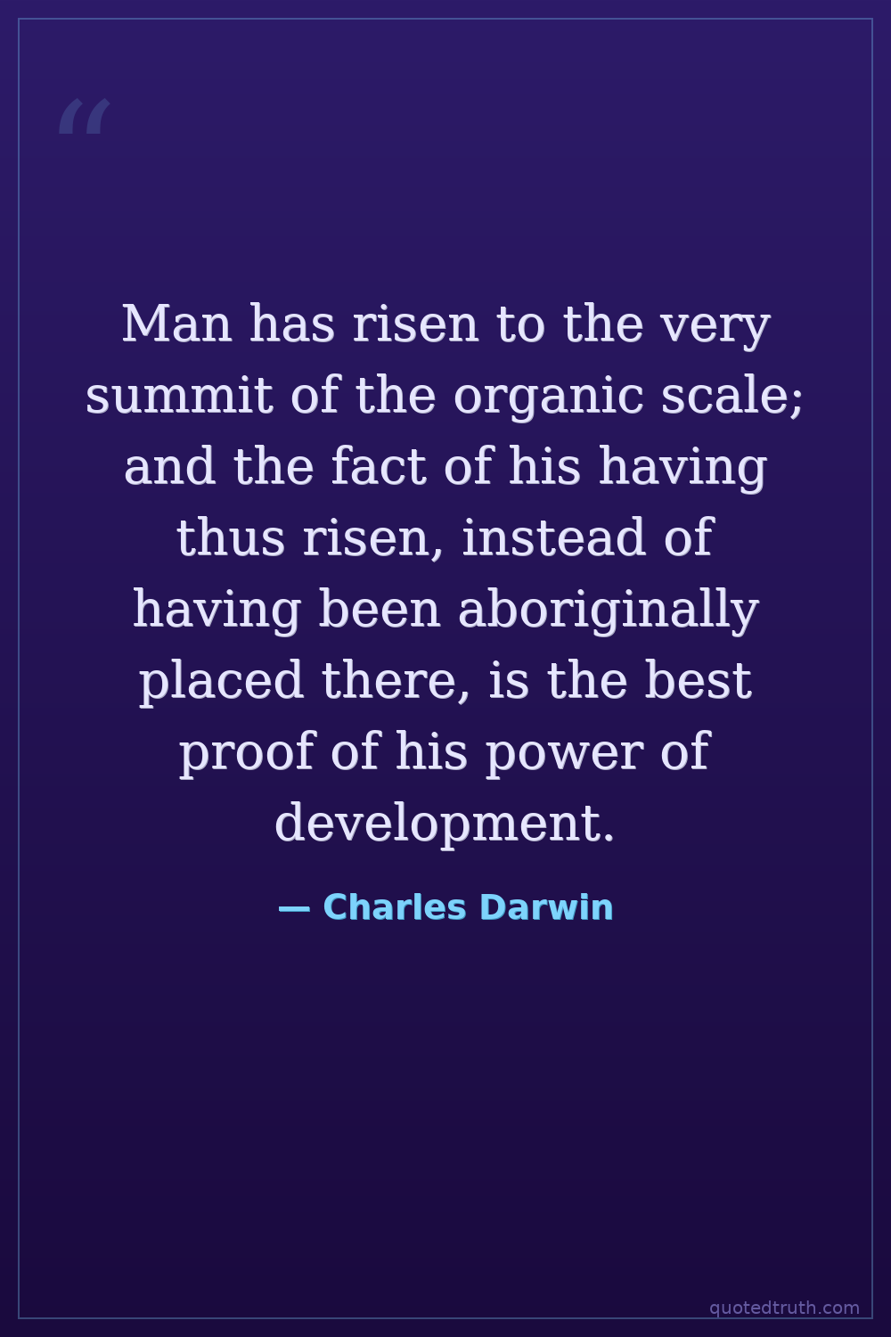 Man has risen to the very summit of the organic scale; and the fact of his having thus risen, instead of having been aboriginally placed there, is the best proof of his power of development.
