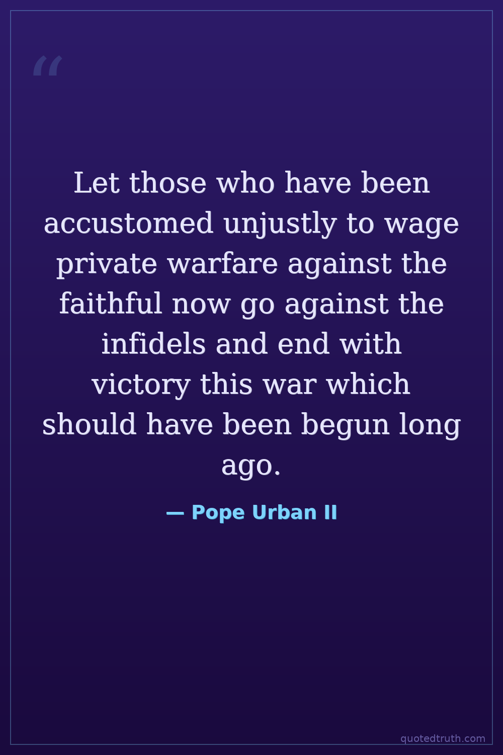 Let those who have been accustomed unjustly to wage private warfare against the faithful now go against the infidels and end with victory this war which should have been begun long ago.