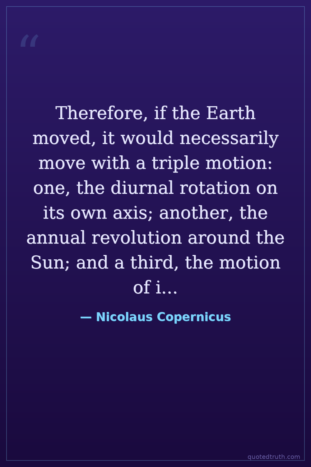 Therefore, if the Earth moved, it would necessarily move with a triple motion: one, the diurnal rotation on its own axis; another, the annual revolution around the Sun; and a third, the motion of its axis.
