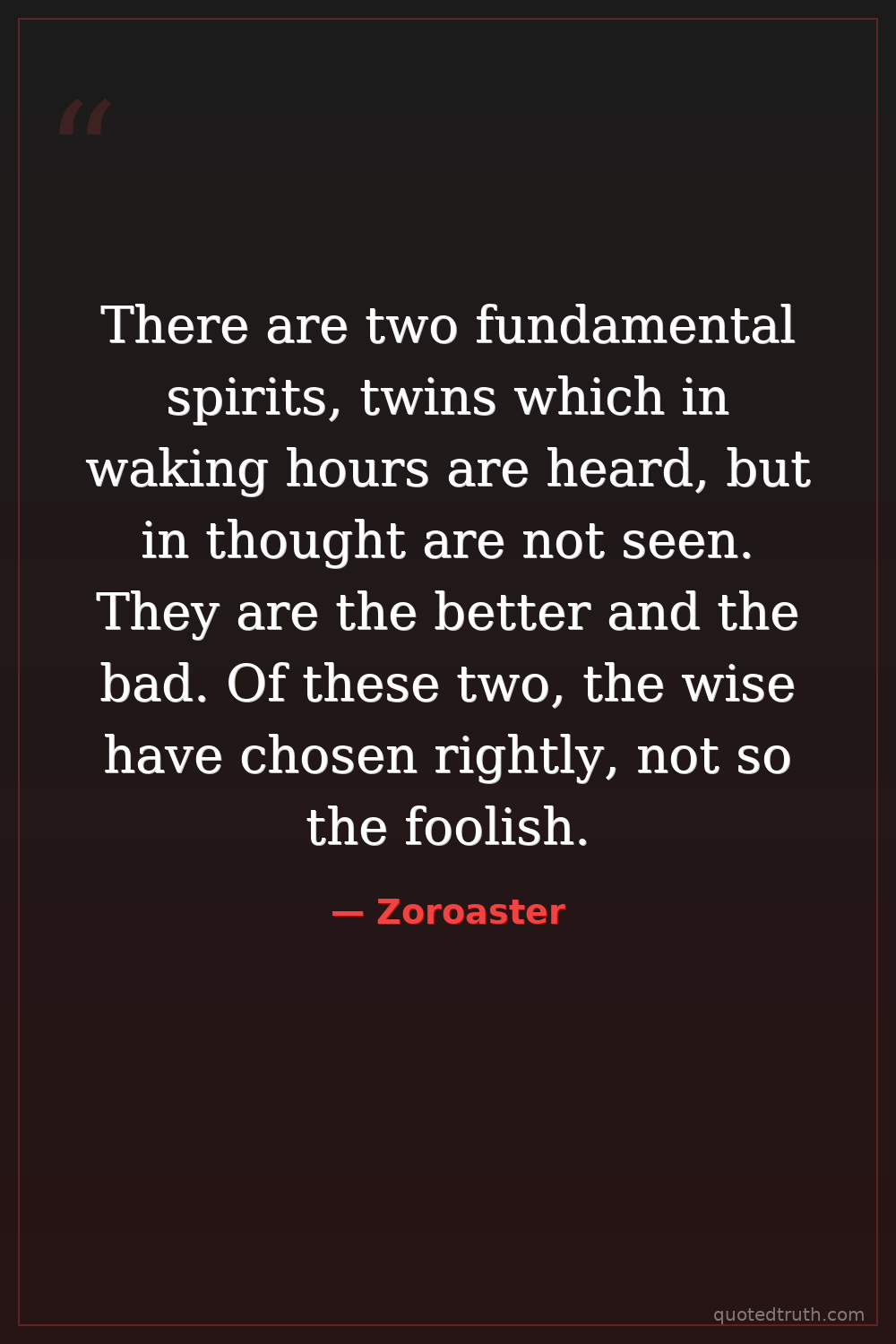 There are two fundamental spirits, twins which in waking hours are heard, but in thought are not seen. They are the better and the bad. Of these two, the wise have chosen rightly, not so the foolish.