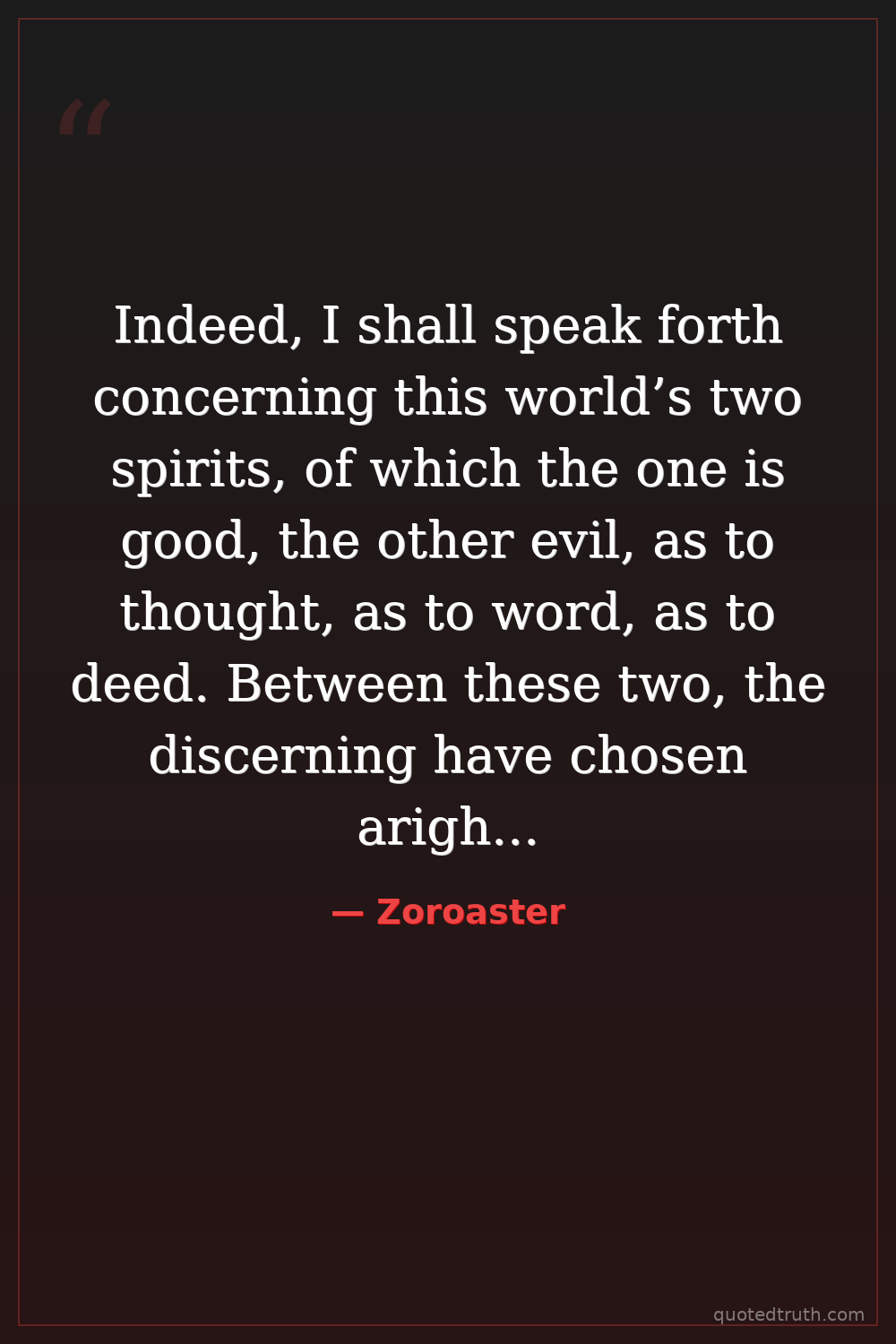 Indeed, I shall speak forth concerning this world’s two spirits, of which the one is good, the other evil, as to thought, as to word, as to deed. Between these two, the discerning have chosen aright, not so the undiscerning.