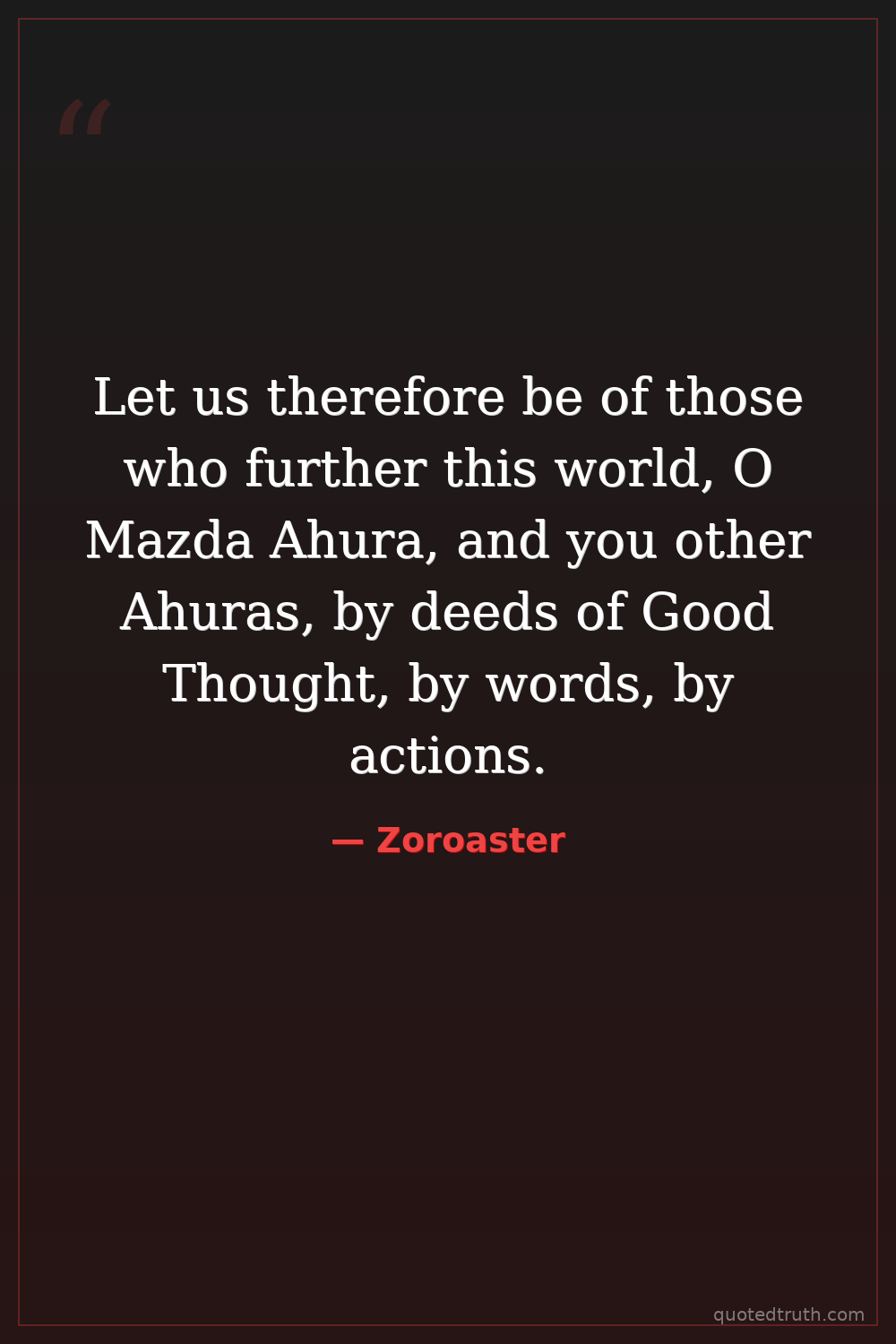 Let us therefore be of those who further this world, O Mazda Ahura, and you other Ahuras, by deeds of Good Thought, by words, by actions.