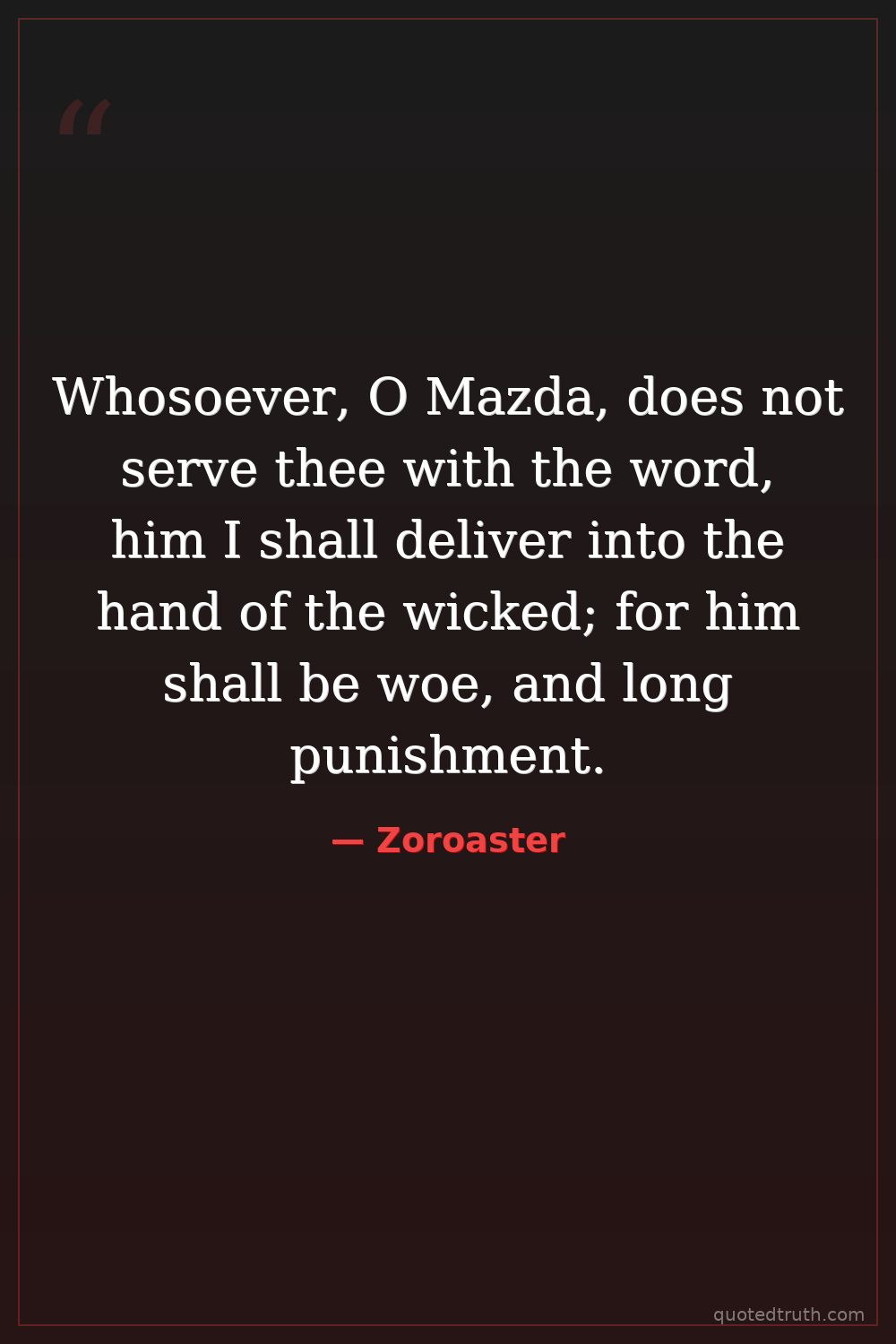 Whosoever, O Mazda, does not serve thee with the word, him I shall deliver into the hand of the wicked; for him shall be woe, and long punishment.