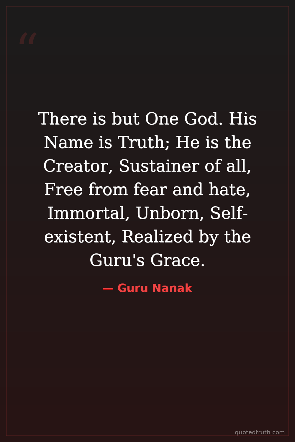 There is but One God. His Name is Truth; He is the Creator, Sustainer of all, Free from fear and hate, Immortal, Unborn, Self-existent, Realized by the Guru's Grace.
