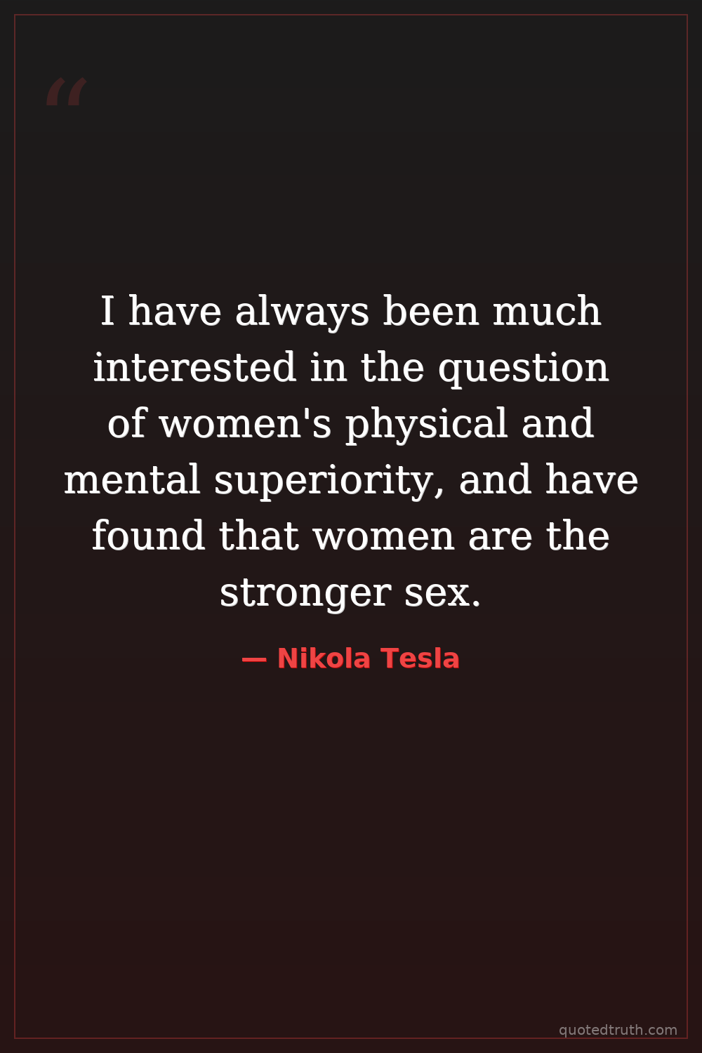 I have always been much interested in the question of women's physical and mental superiority, and have found that women are the stronger sex.