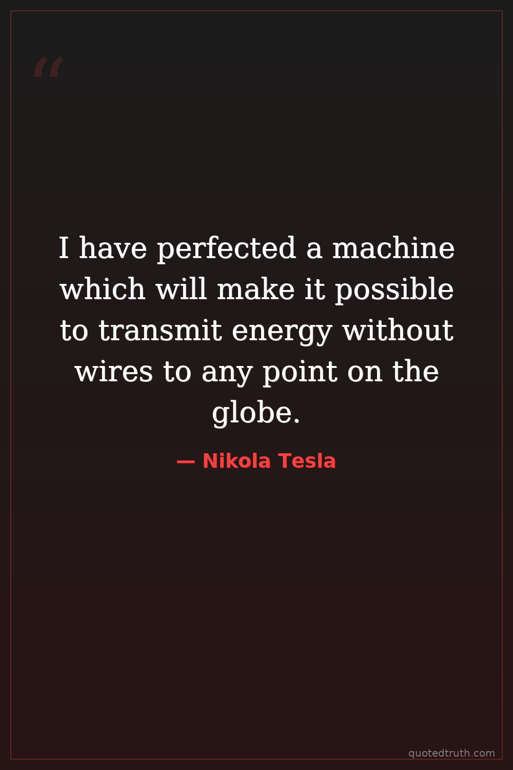 I have perfected a machine which will make it possible to transmit energy without wires to any point on the globe.