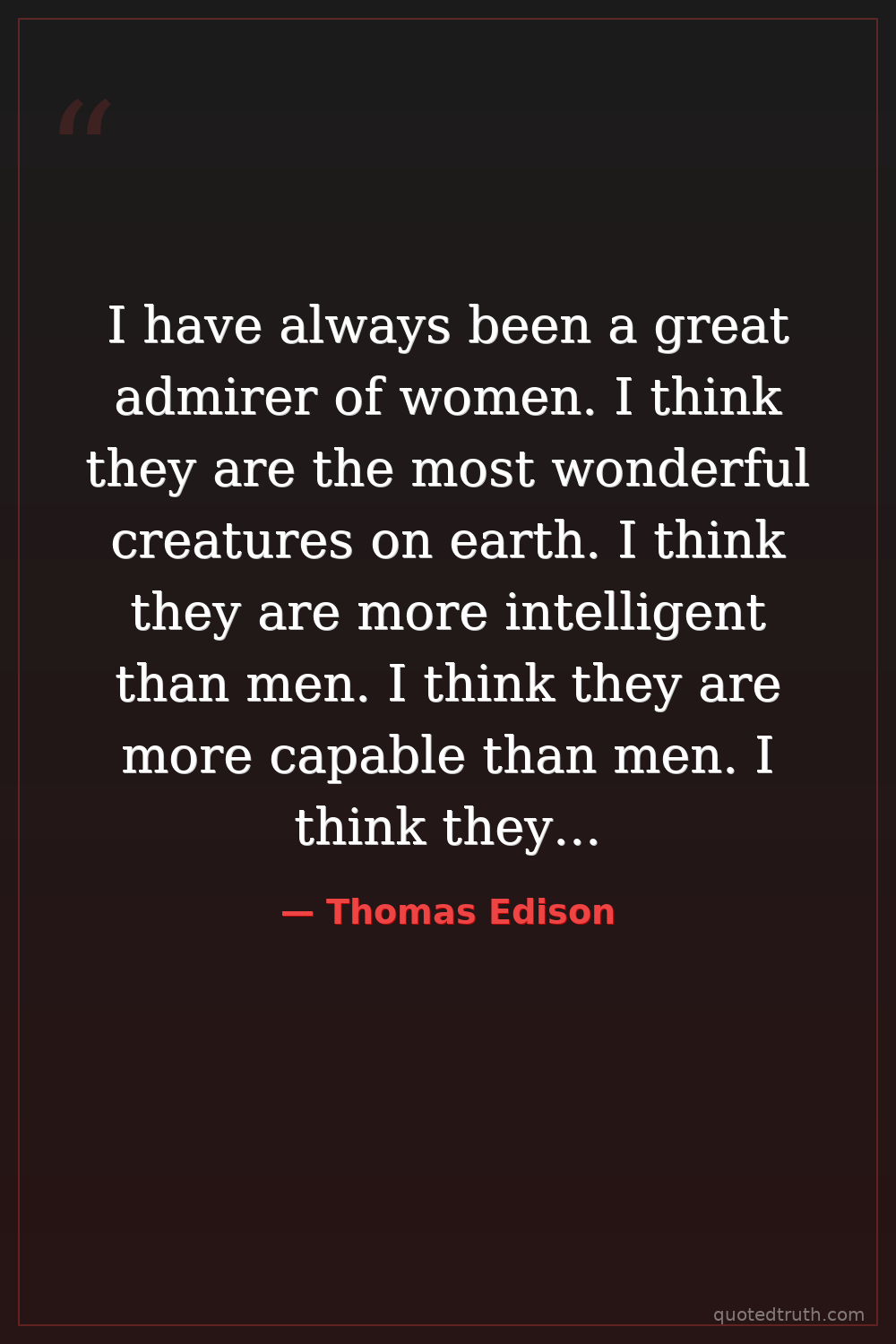 I have always been a great admirer of women. I think they are the most wonderful creatures on earth. I think they are more intelligent than men. I think they are more capable than men. I think they are more practical than men. — Thomas Edison Modern Light bulb, phonograph, inventor