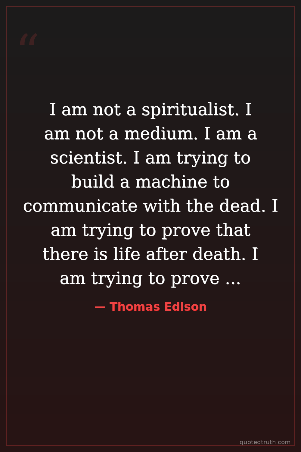 I am not a spiritualist. I am not a medium. I am a scientist. I am trying to build a machine to communicate with the dead. I am trying to prove that there is life after death. I am trying to prove that the soul is immortal. — Thomas Edison Modern Light bulb, phonograph, inventor