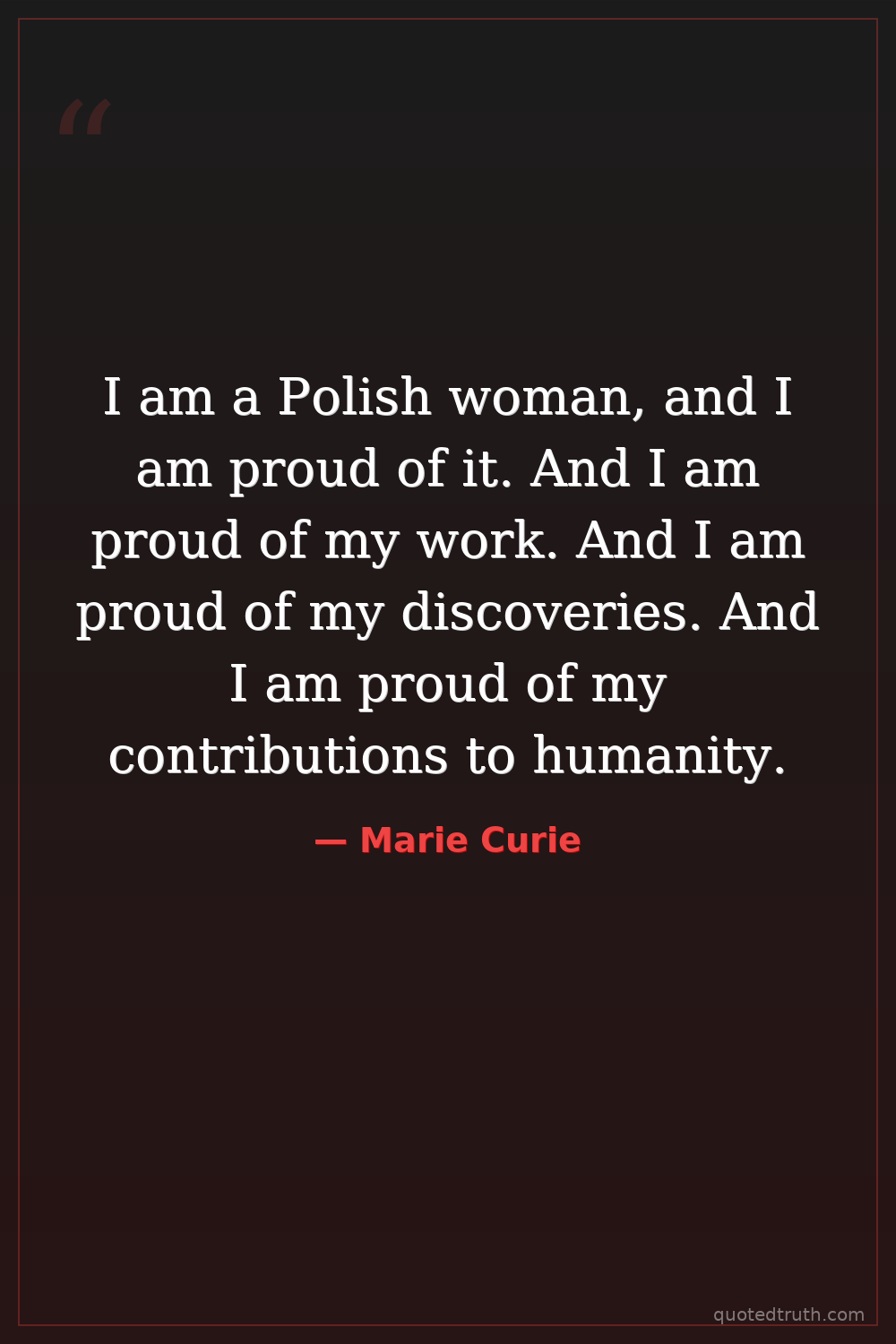 I am a Polish woman, and I am proud of it. And I am proud of my work. And I am proud of my discoveries. And I am proud of my contributions to humanity.