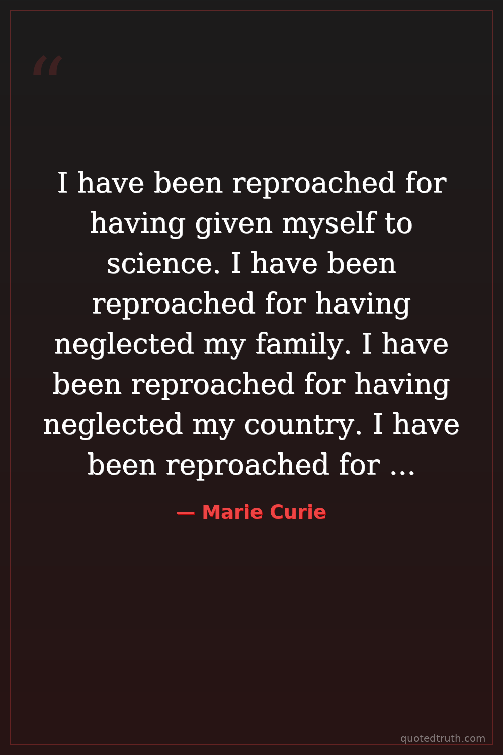 I have been reproached for having given myself to science. I have been reproached for having neglected my family. I have been reproached for having neglected my country. I have been reproached for having neglected my God. I have been reproached for having neglected my soul. I have been reproached for having neglected my body. I have been reproached for having neglected everything. But I have not neglected anything. I have only done my duty. And I am proud of it.
