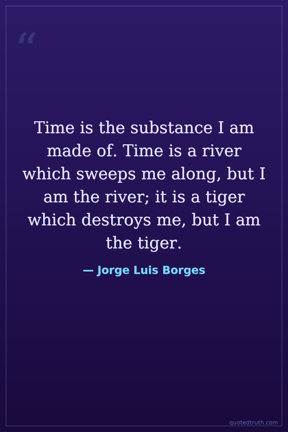 Time is the substance I am made of. Time is a river which sweeps me along, but I am the river; it is a tiger which destroys me, but I am the tiger.