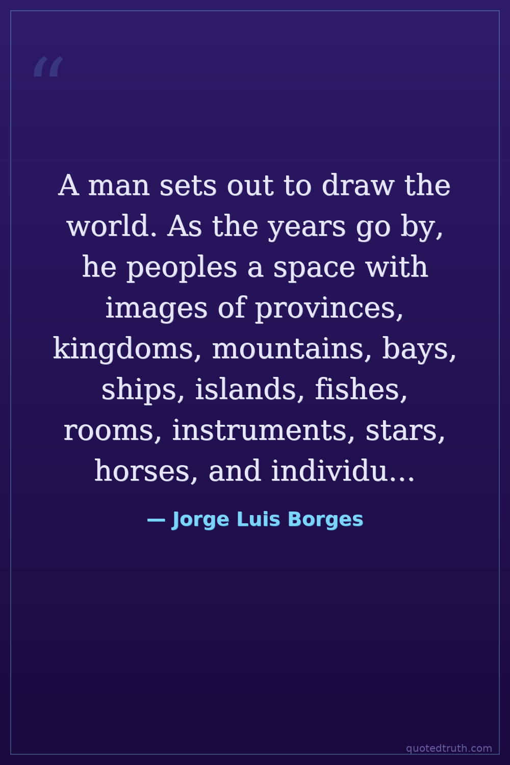 A man sets out to draw the world. As the years go by, he peoples a space with images of provinces, kingdoms, mountains, bays, ships, islands, fishes, rooms, instruments, stars, horses, and individuals. A short time before he dies, he discovers that the patient labyrinth of lines traces the image of his own face.
