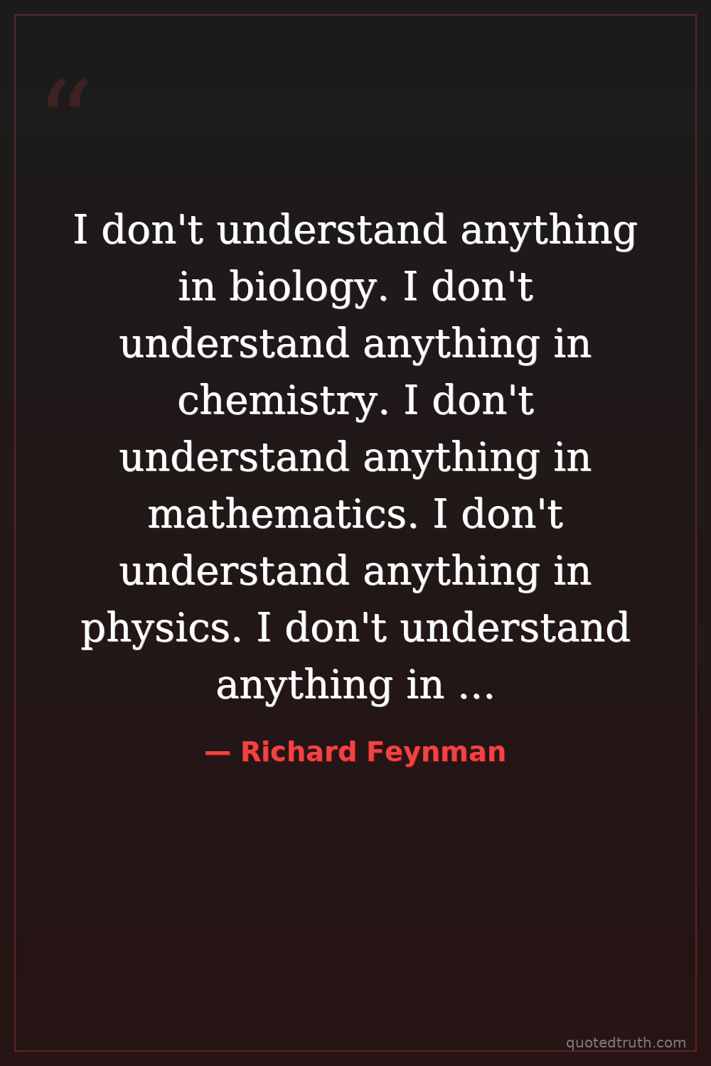 I don't understand anything in biology. I don't understand anything in chemistry. I don't understand anything in mathematics. I don't understand anything in physics. I don't understand anything in anything. But I understand how to learn. — Richard Feynman Modern Quantum electrodynamics