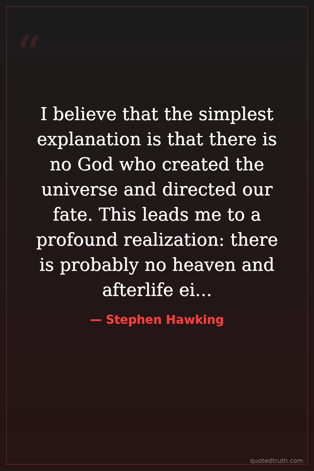 I believe that the simplest explanation is that there is no God who created the universe and directed our fate. This leads me to a profound realization: there is probably no heaven and afterlife either. I think belief in an afterlife is just wishful thinking.