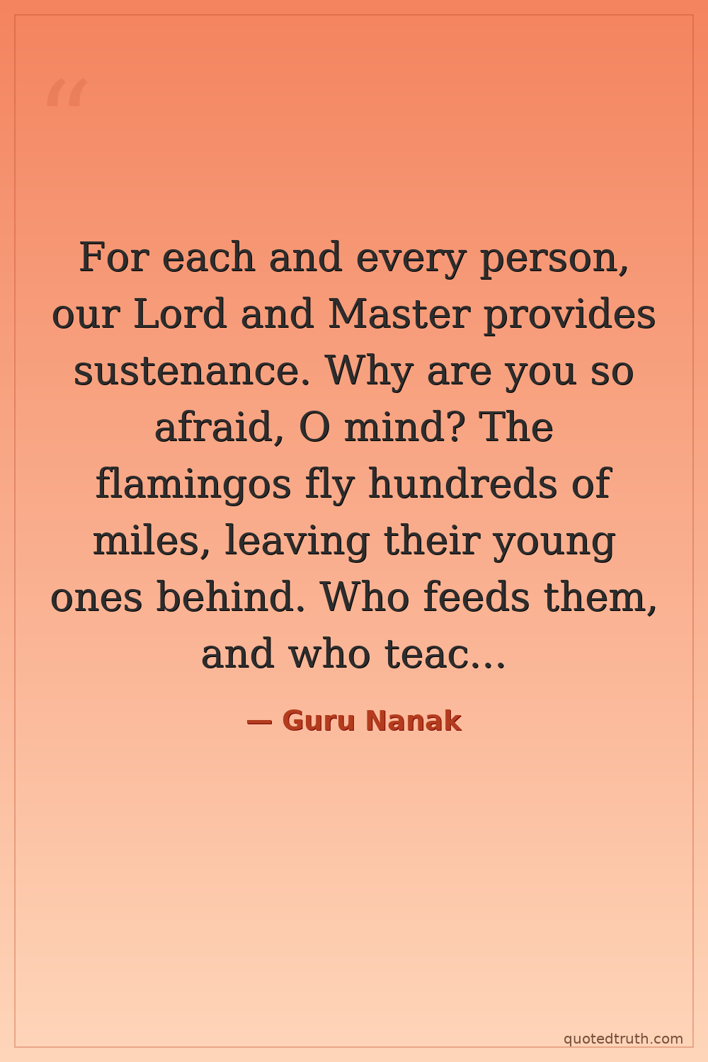 For each and every person, our Lord and Master provides sustenance. Why are you so afraid, O mind? The flamingos fly hundreds of miles, leaving their young ones behind. Who feeds them, and who teaches them to feed themselves? Have you ever thought of this in your mind?
